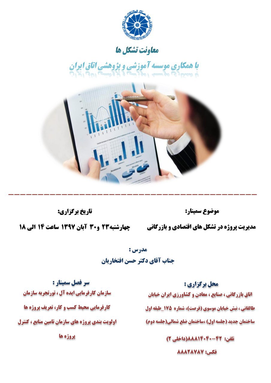 | ۹۷٫۸٫۳۰ | نامه وارده از معاونت تشکل های اتاق بازرگانی ایران با همکاری موسسه آموزشی و پژوهشی اتاق اقدام به برگزاری سمینار مدیریت پروژه در تشکل های اقتصادی و بازرگانی در تاریخ های ۲۳ و ۳۰ آبان ۹۷ در محل ساختمان جدید اتاق بازرگانی ایران نموده است | ↓ | |