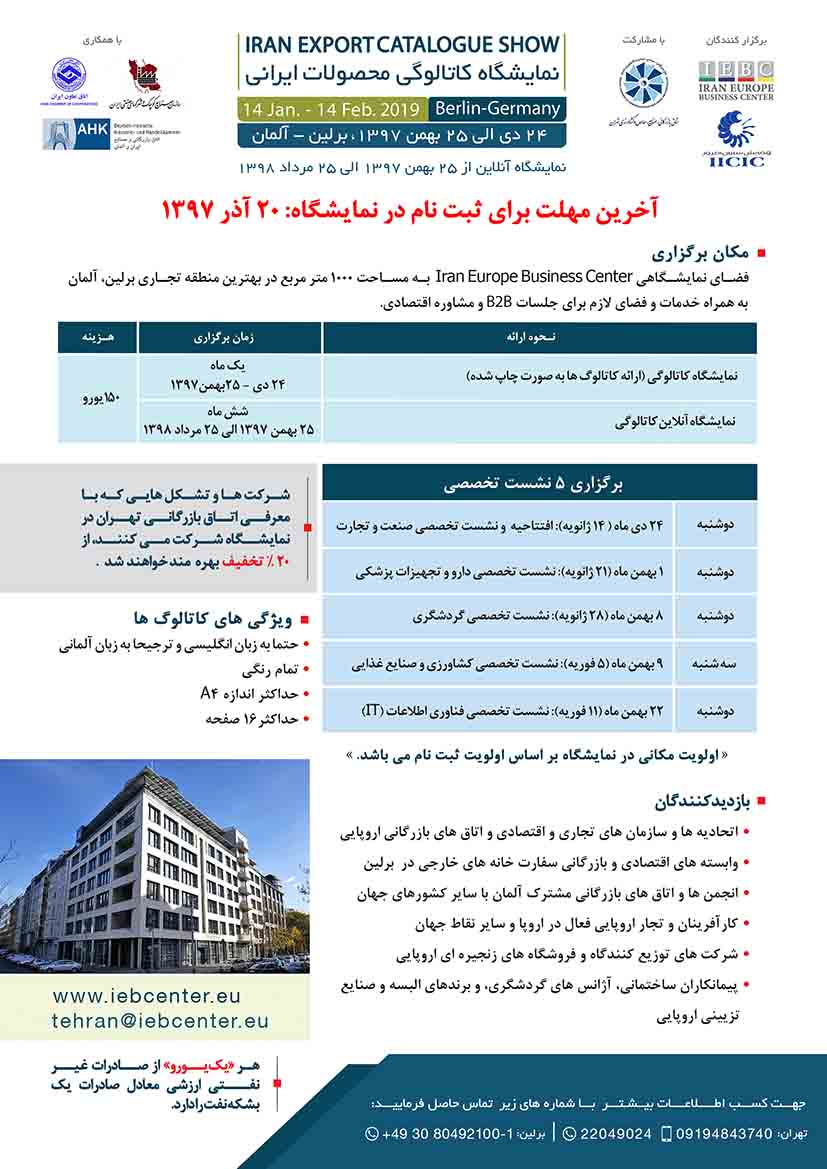 | ۹۷٫۸٫۲۸ | نامه وارده از دفتر مدیر تشکل ها ومسئولیت اجتماعی اتاق تهران در خصوص برگزاری نمایشگاه کاتولوگی محصولات ایرانی از تاریخ ۲۴ دی ماه ۲۵لغایت بهمن ماه ۹۷ توسط مرکز همکاری های اقتصادی، تجاری ایران و اروپا در محل ساختمان مرکزی برلین | ↓ | |