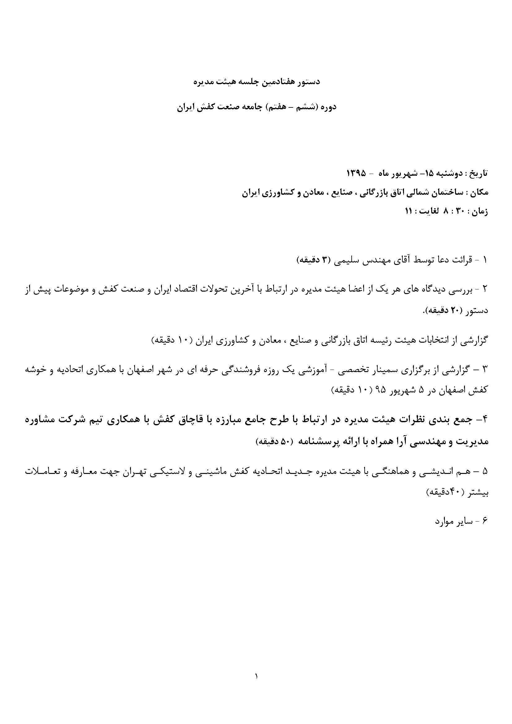 | دستور هفتادمین جلسه هیئت مدیره دوره هفتم جامعه صنعت کفش ایران | ۱۳۹۵/۰۶/۱۵ | |