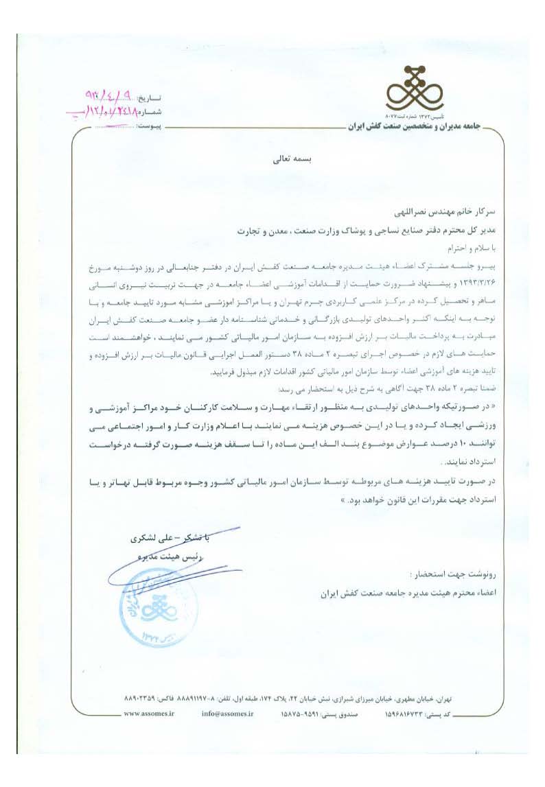 تبریک به خانم نصراللهی مدیر کل نساجی و پوشاک وزارت صنایع