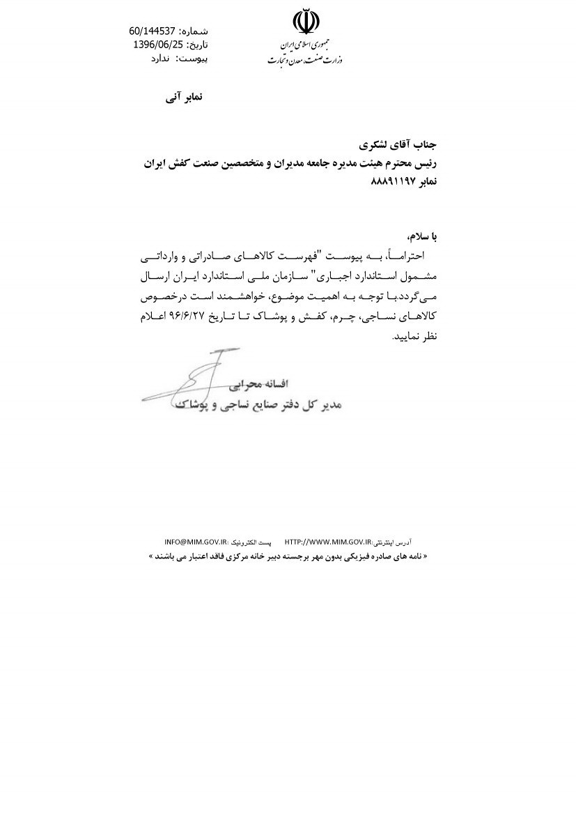 | ۱۳۹۶٫۶٫۲۵ | دفتر صنایع نساجی و پوشاک وزارت صنعت معدن و تجارت در خصوص فهرست کالاهای صادراتی و وارداتی مشمول استاندارد اجباری | ↓ | |